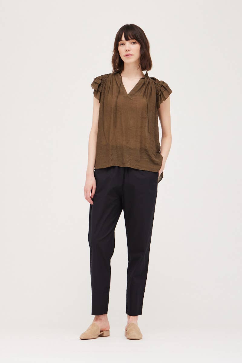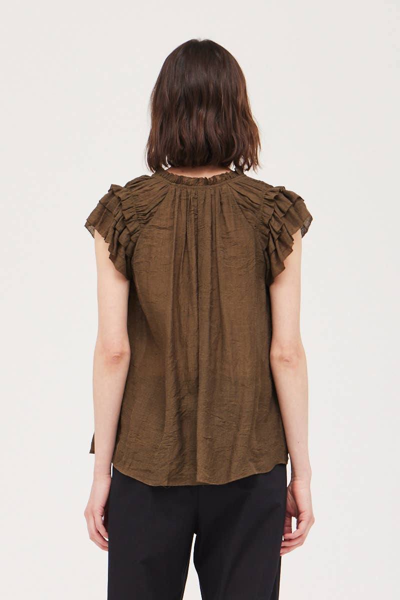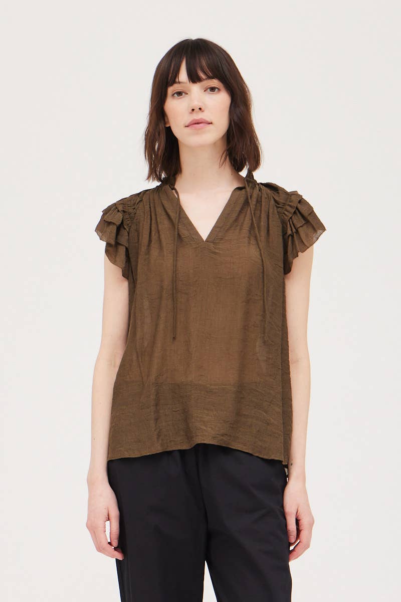 This lightweight chestnut brown blouse is perfect for any occasion. Features a v-neck and ruffle sleeves.
