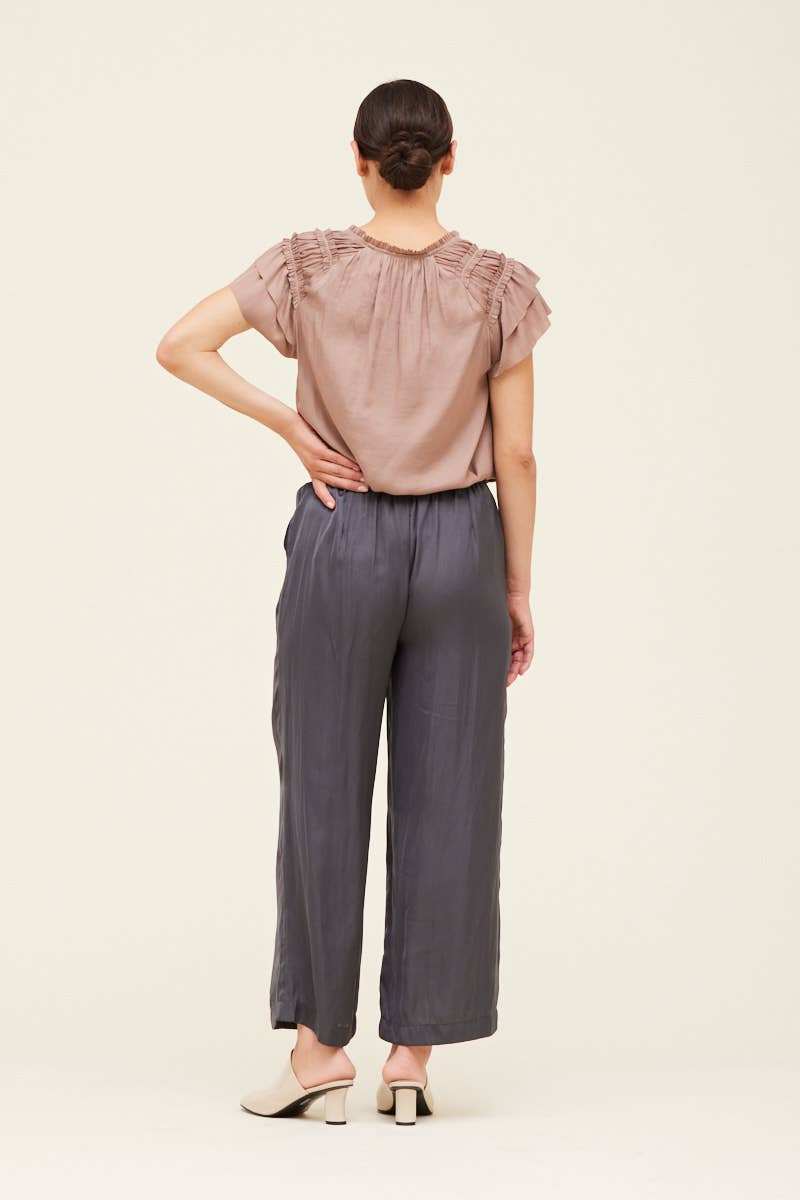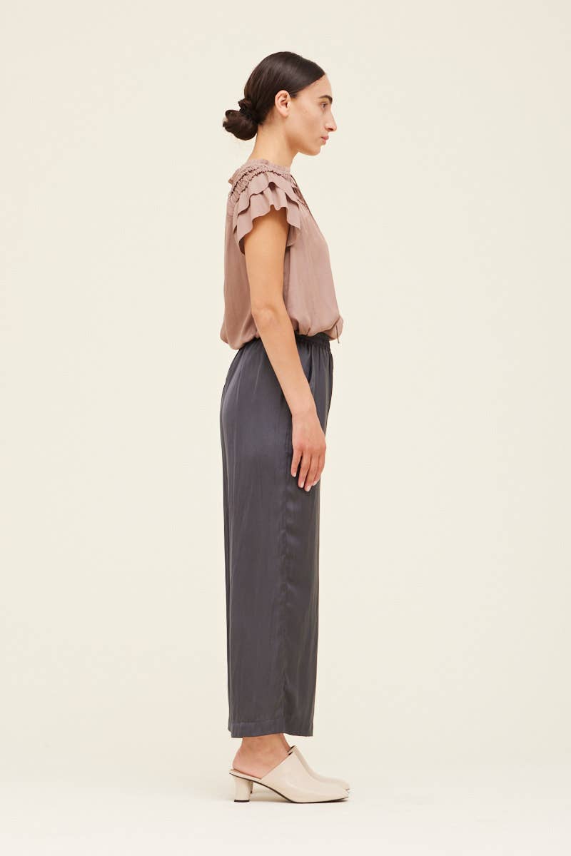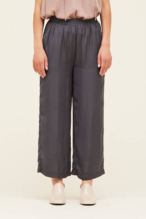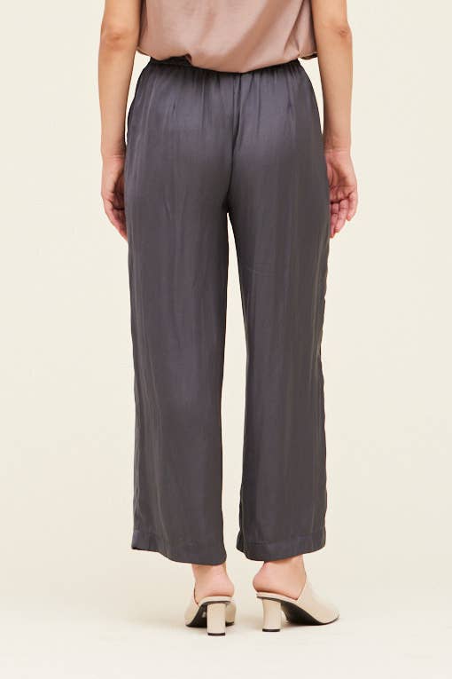 These charcoal colored satin pants feature an elastic waist and a wide legged fit.