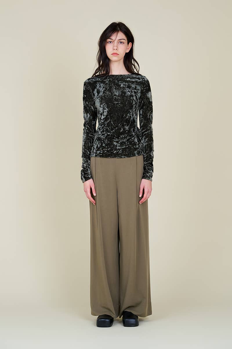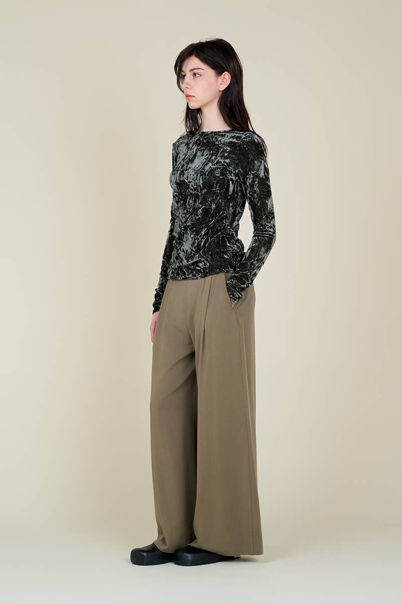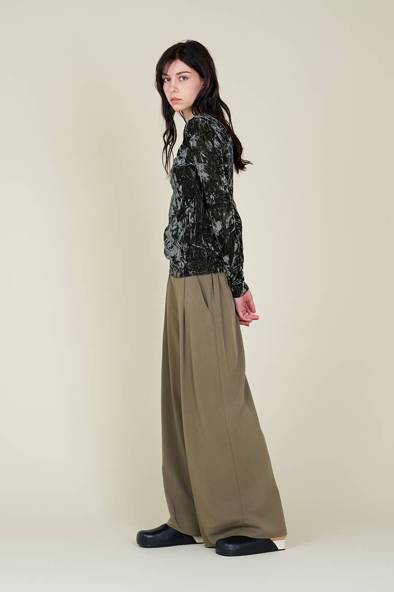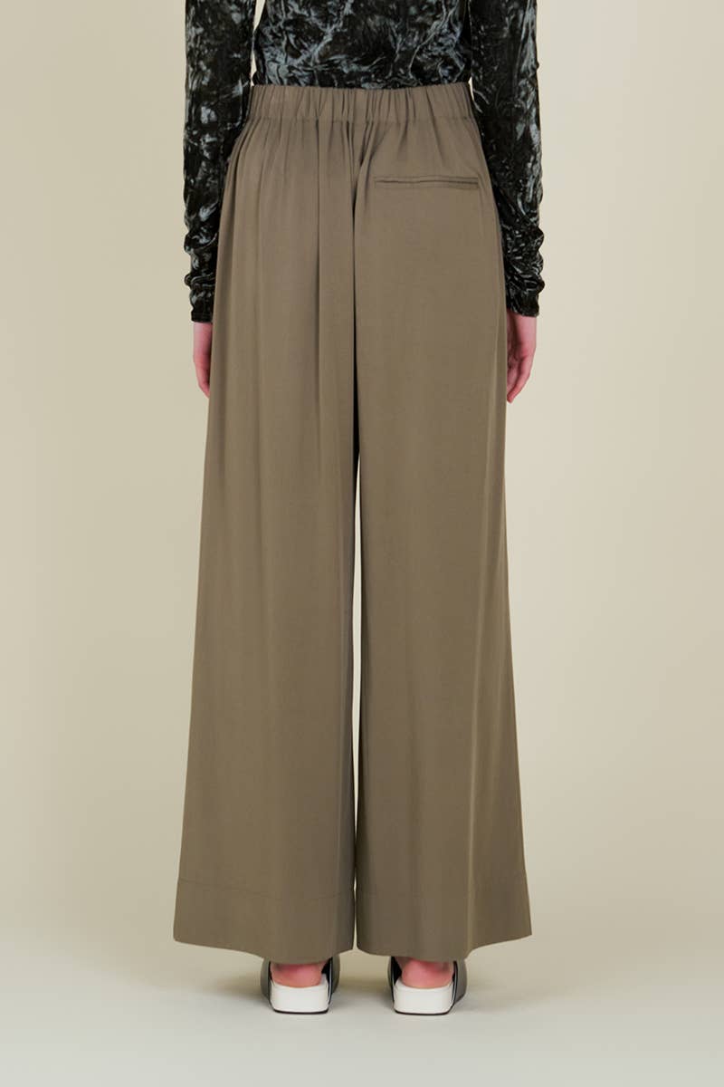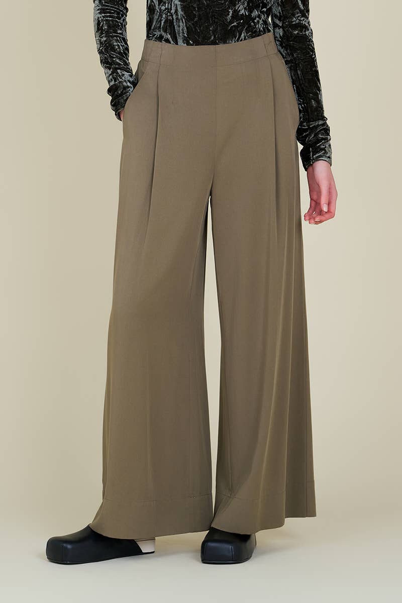 Wide leg tencel pants with pleated front. Dark olive green color.