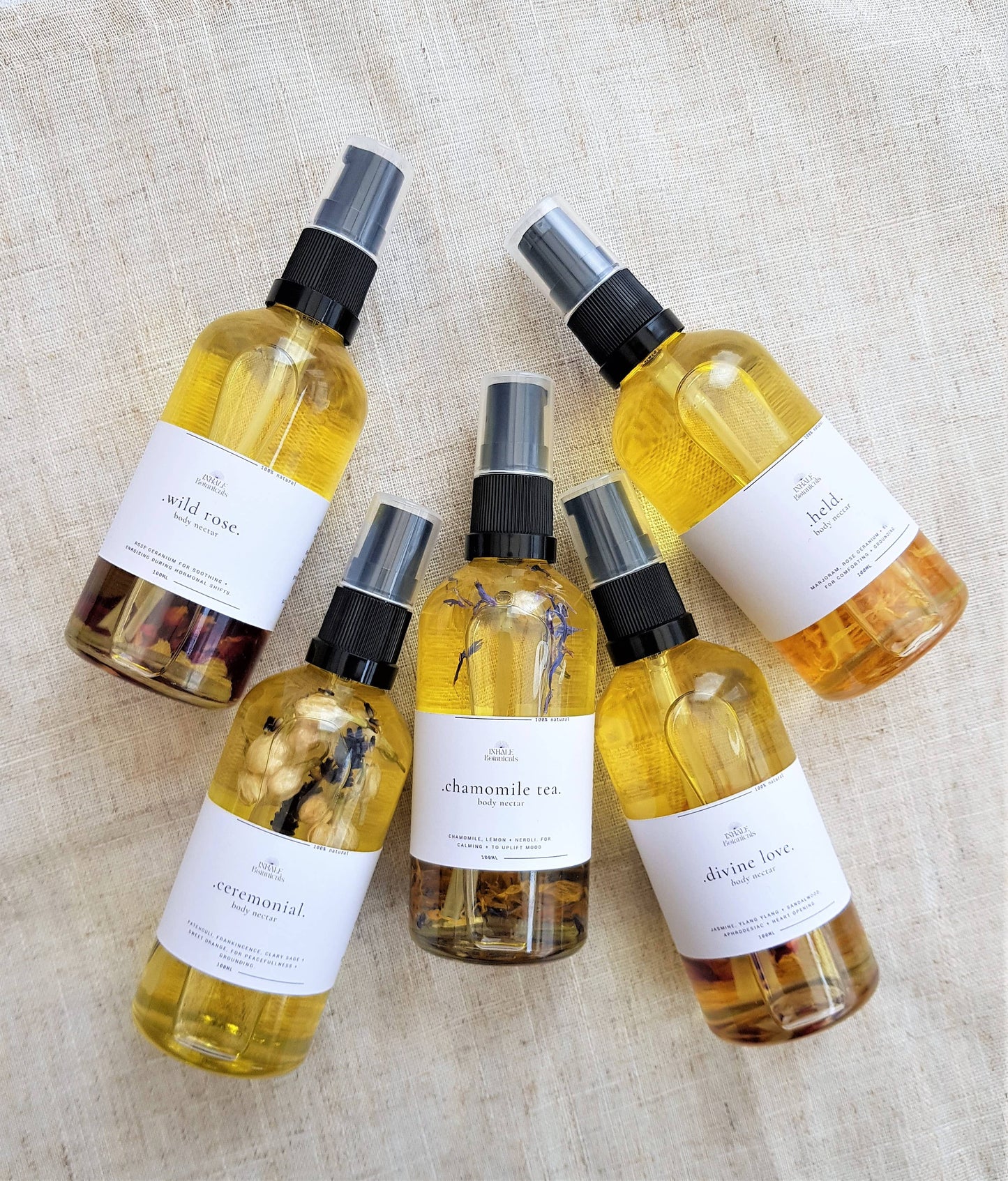 Nourish your mind, body + skin with our velvety, quickly absorbed Body Nectar. Rich with botanical goodness, our nectar is a deeply replenishing oil for day or night, making it perfect for your daily meditations + rituals as well as massage.