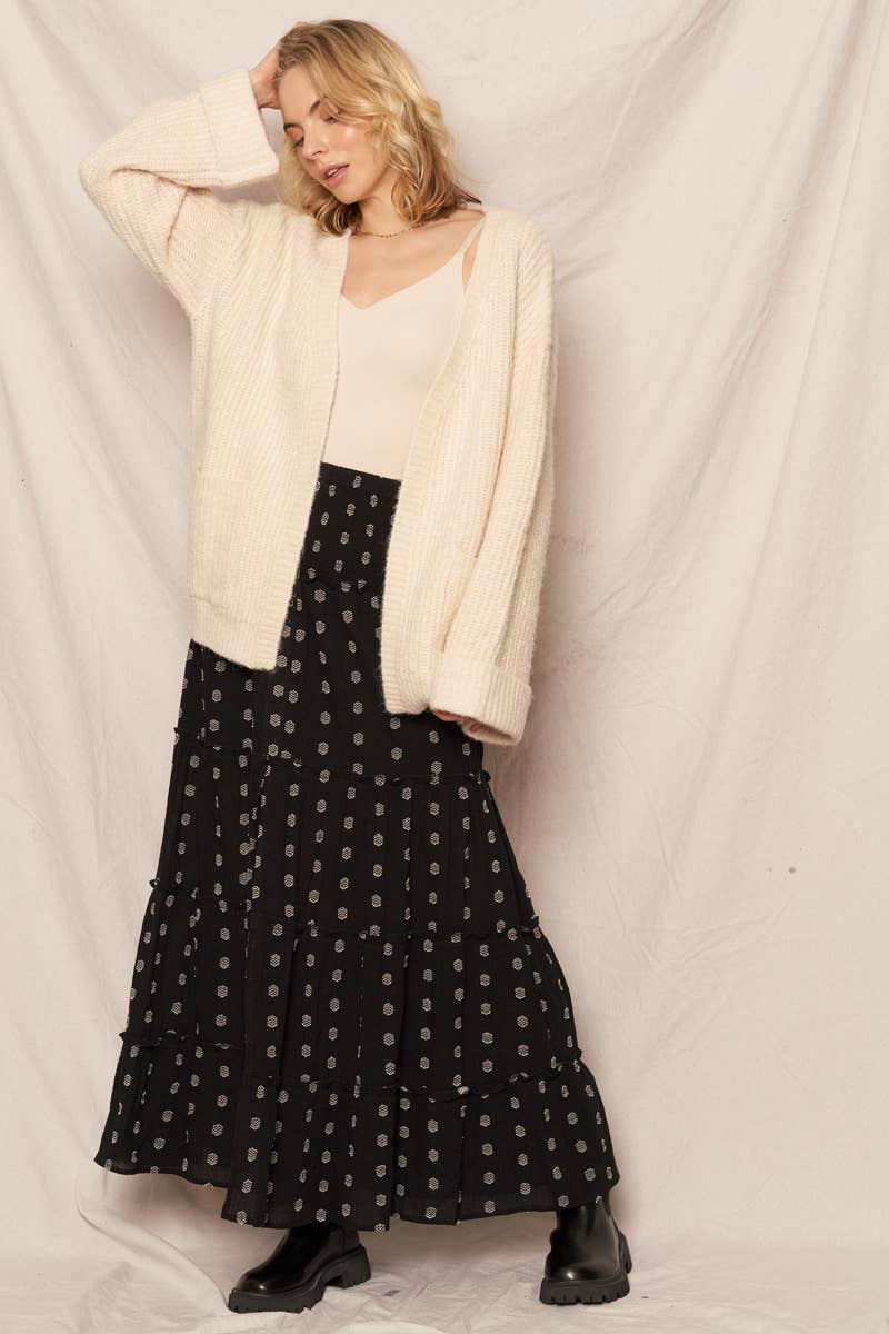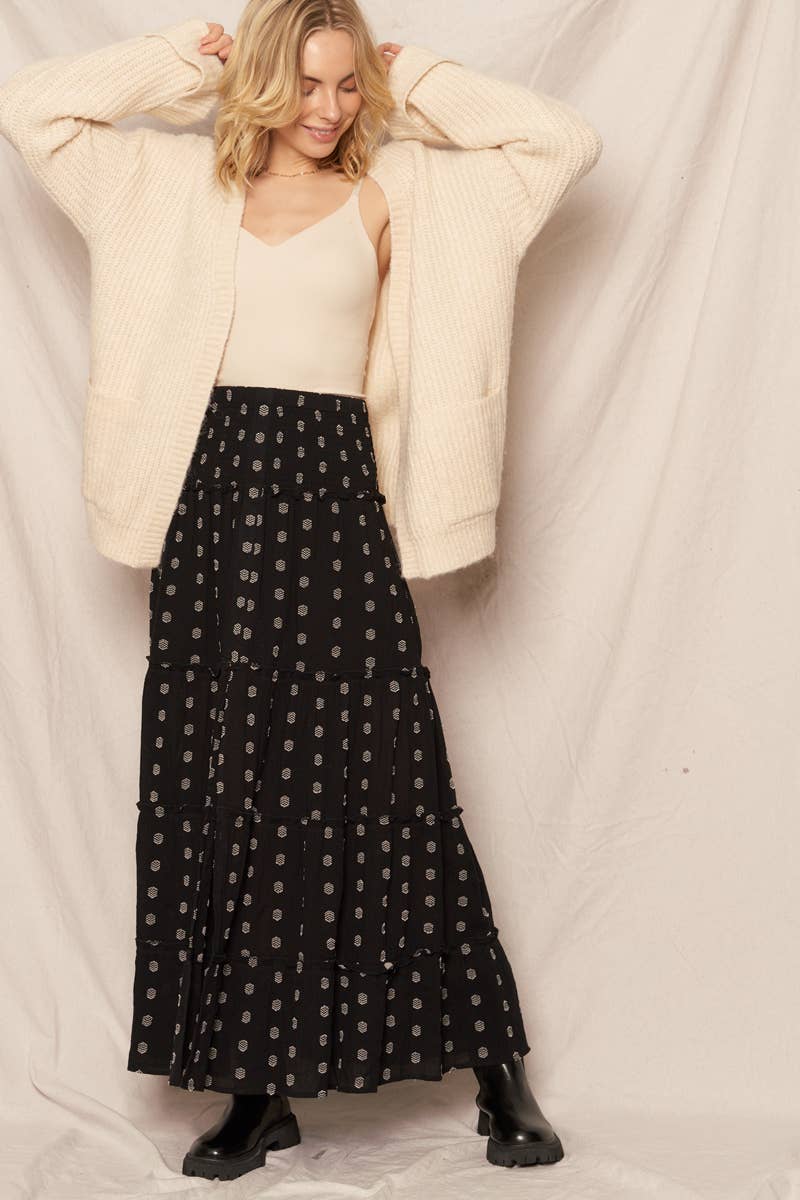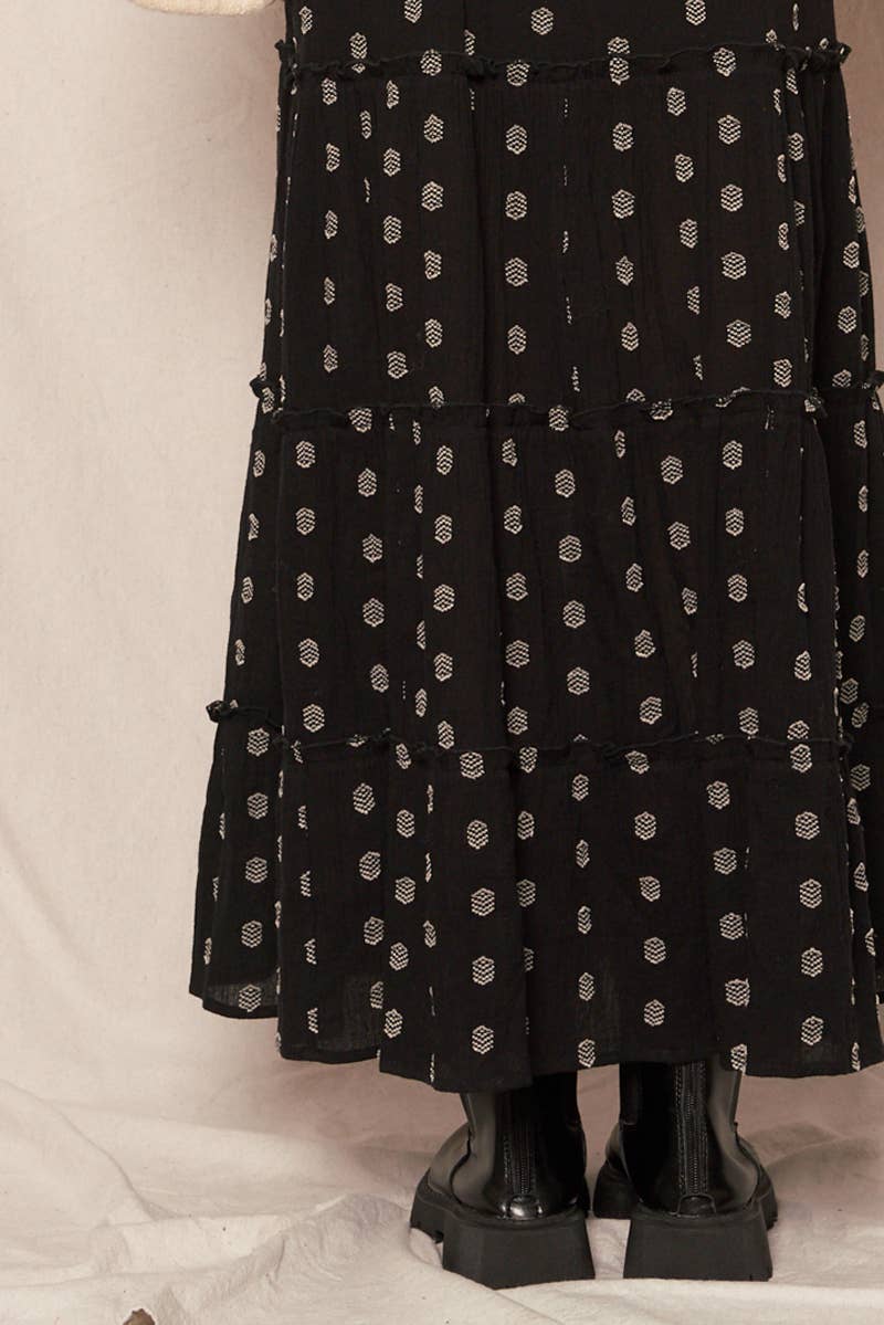Black Embroidered Polka Dot Tiered Maxi Skirt, 100% Cotton