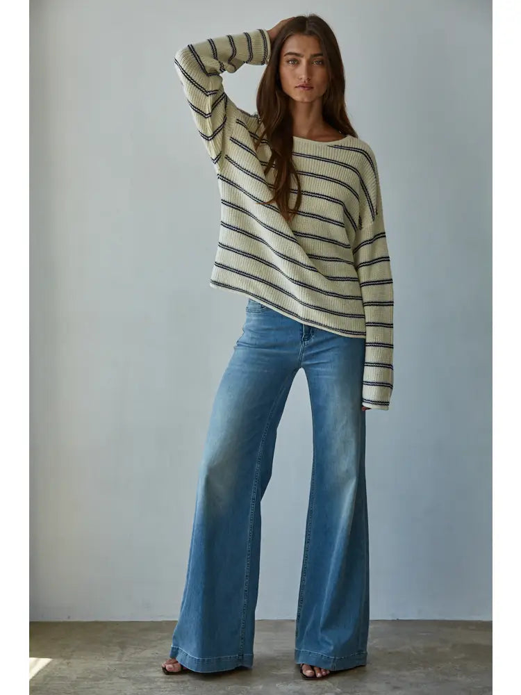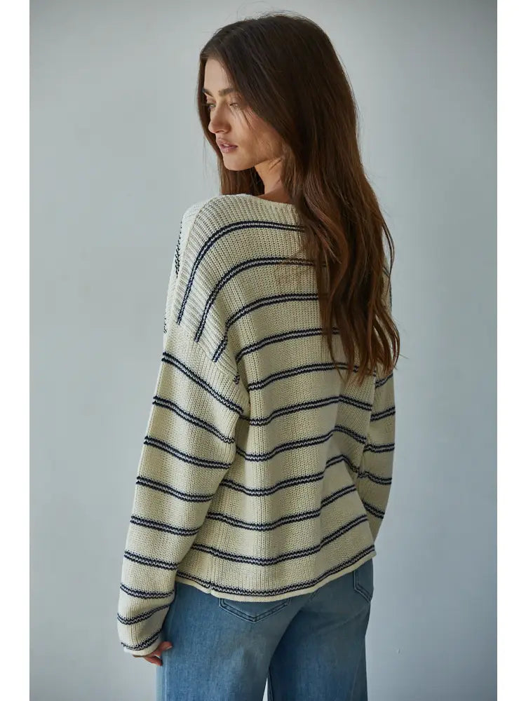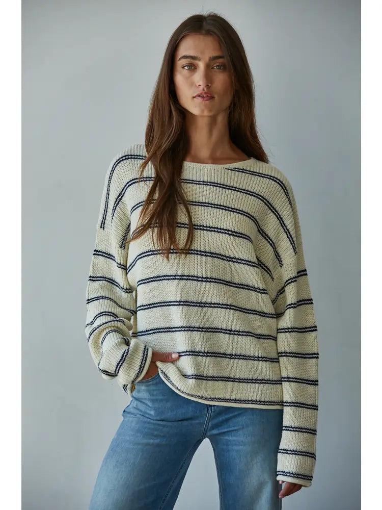 Long sleeve knit pullover sweater with round neckline. Natural color with navy stripes.