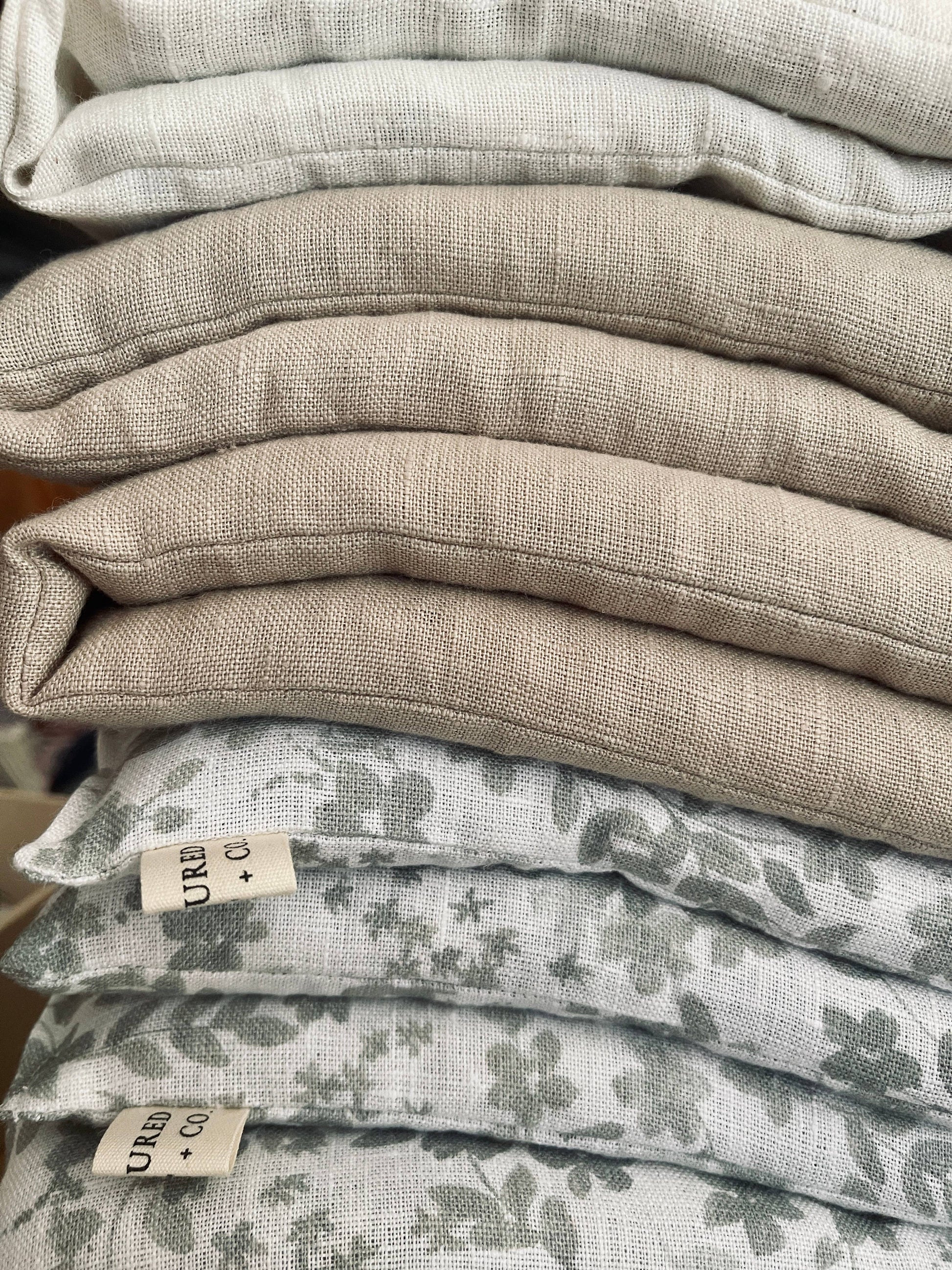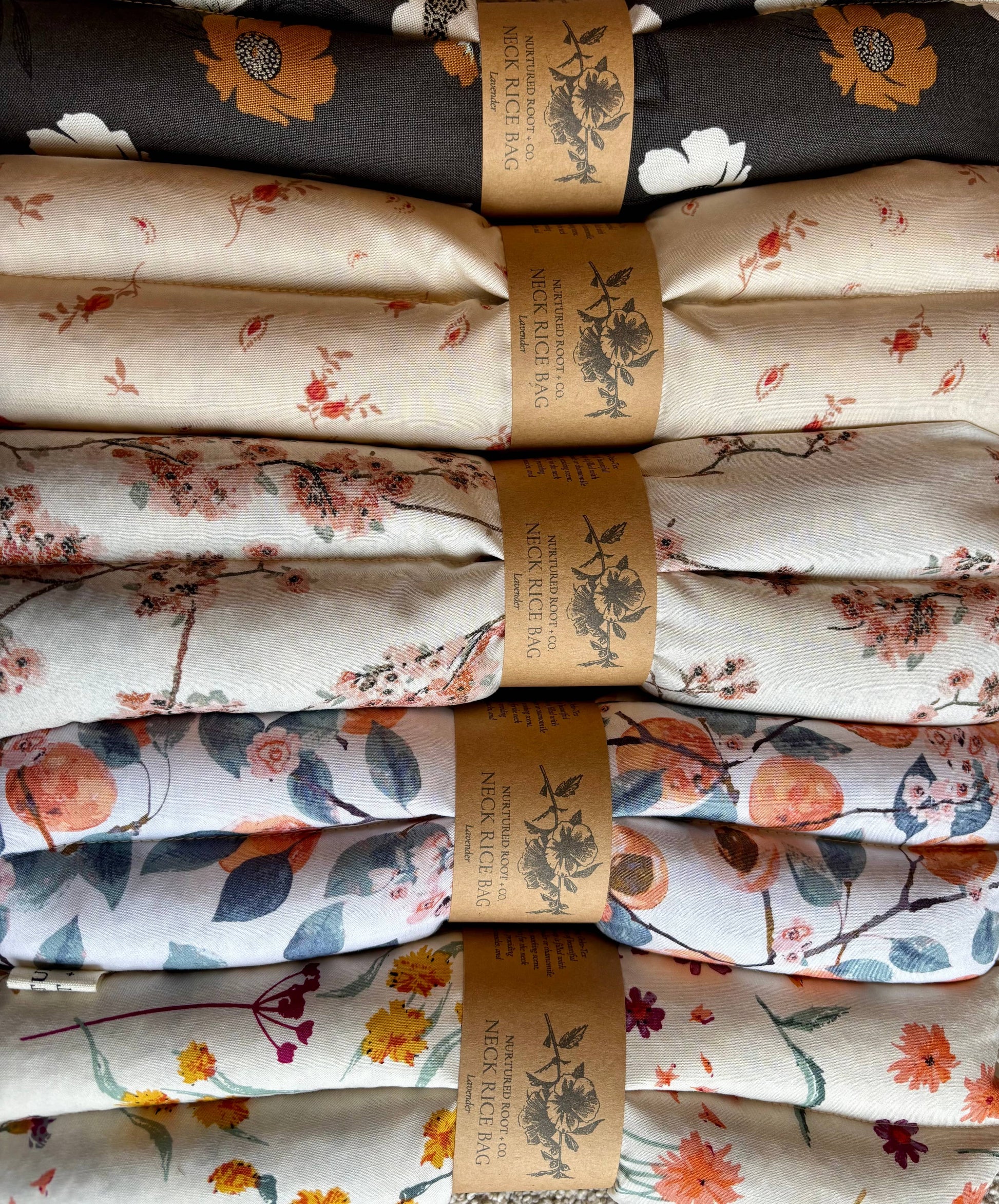 Handmade to order with 100% cotton or linen in beautiful assorted florals and nature inspired colors, filled with unscented rice. Shape is made to rest along the base of your neck and over shoulders.