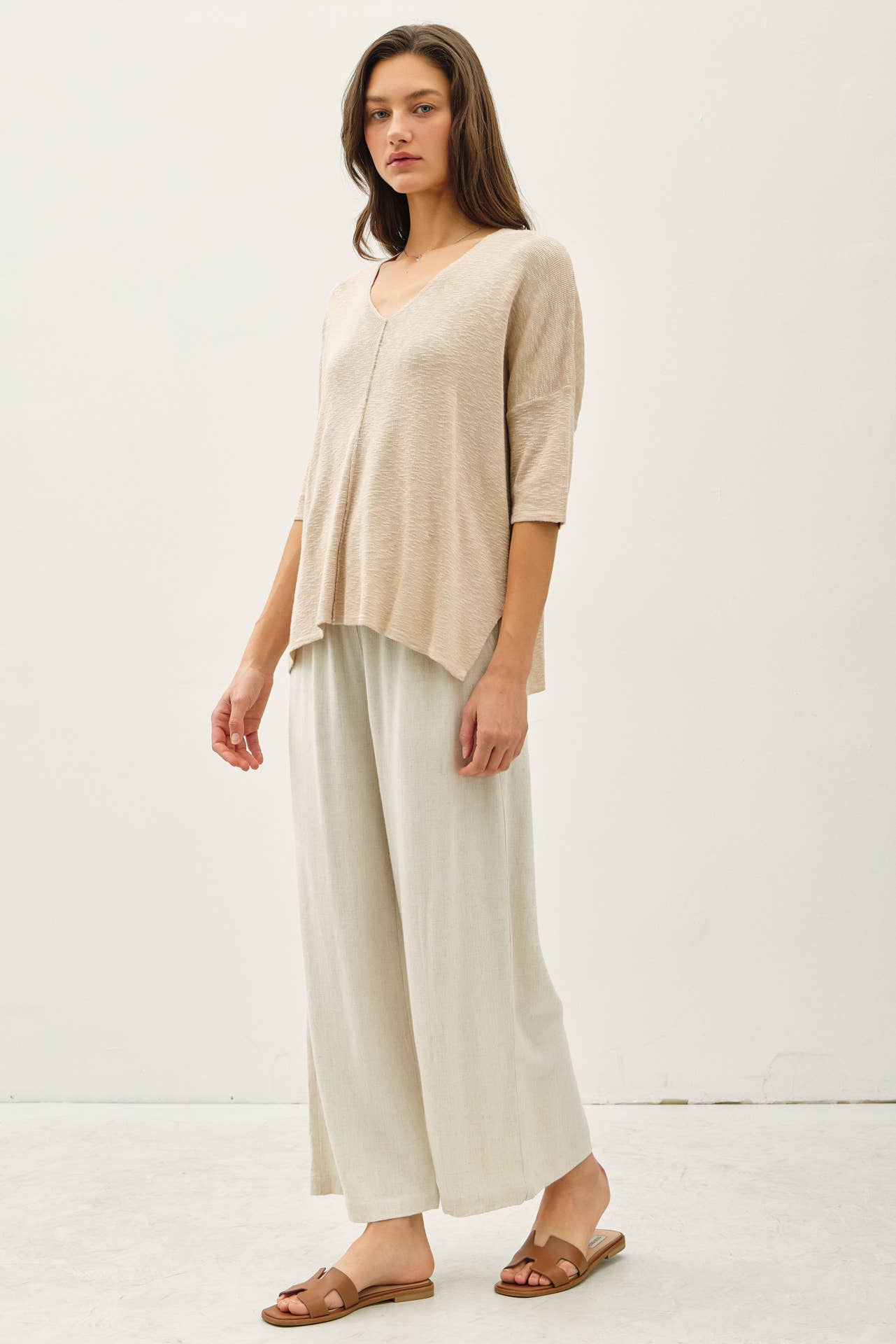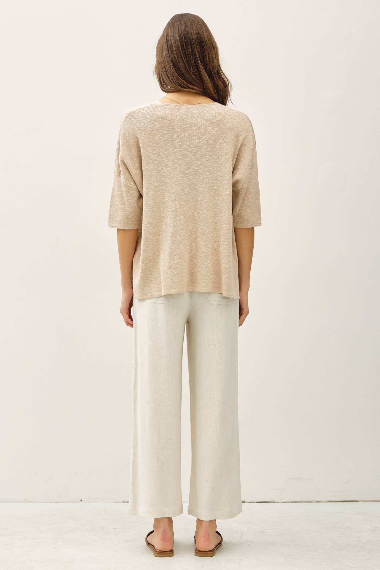 This half sleeve sweater top features a v-neckline, center seam, and side slits. Lightweight and relaxed fit. Beige color.