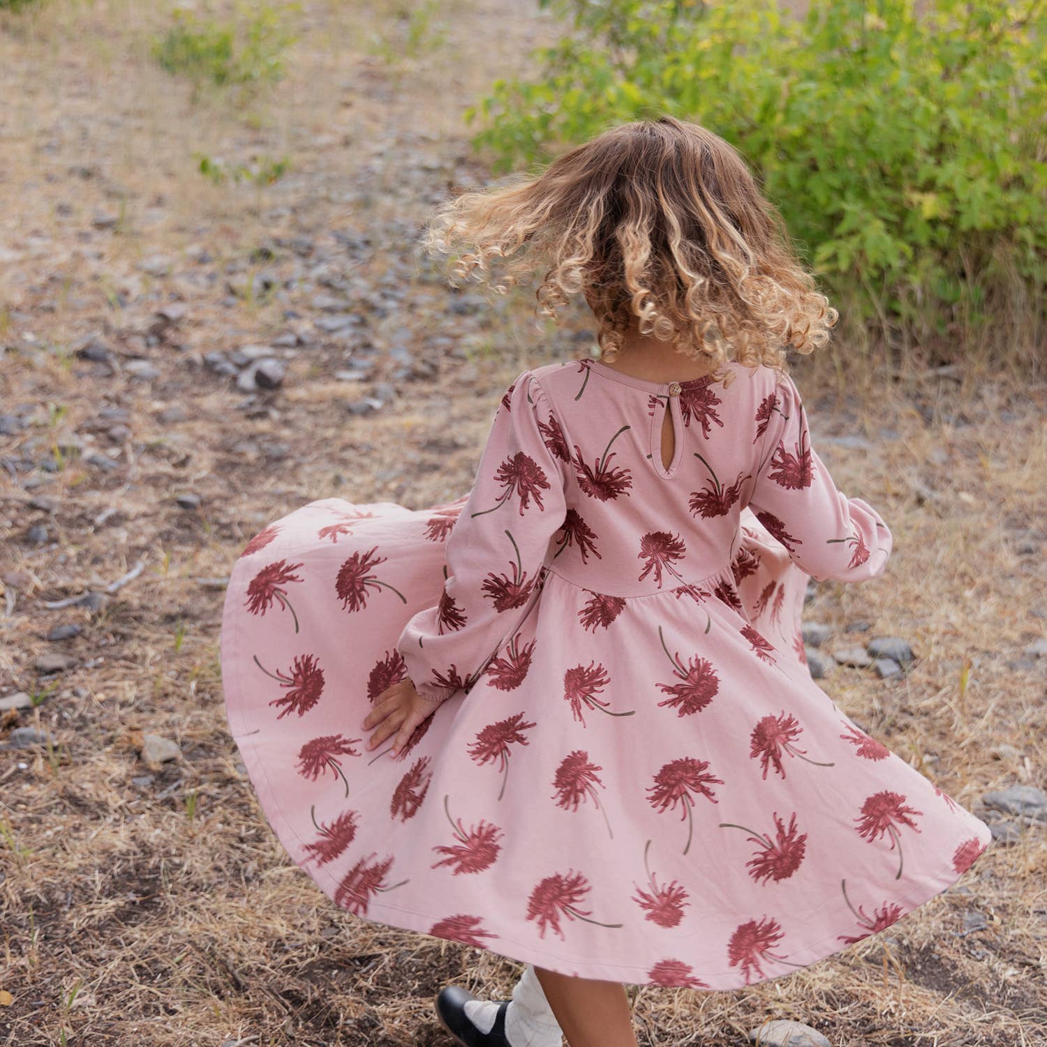 Our favorite twirl dress, made with the softest 100% combed cotton jersey. Featuring full sleeves, a soft elastic waist, and a flared bottom perfect for twirling. In our favorite fall chrysanthemum print, this dress is perfect to twirl from fall to winter! Made in Thailand.