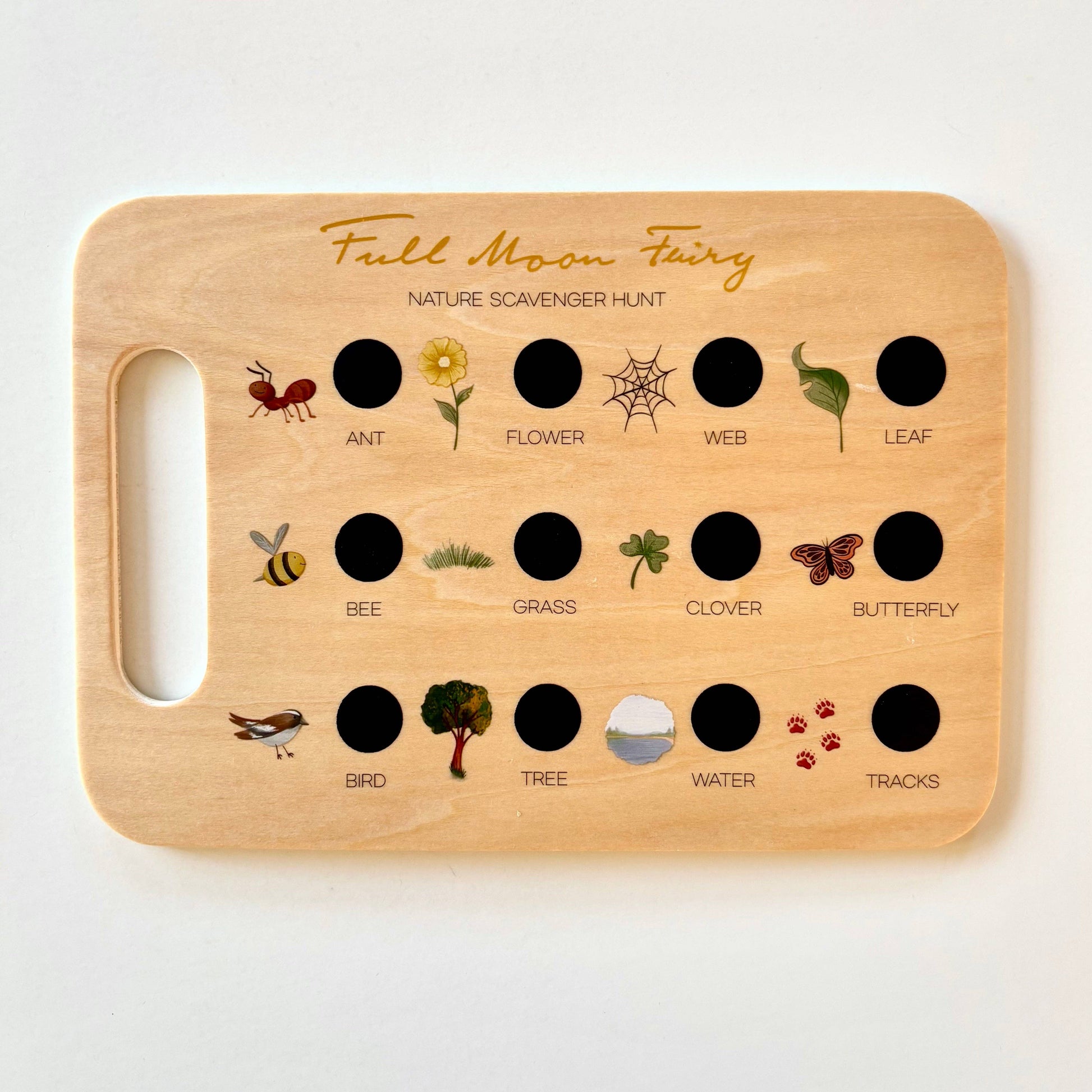 Turn every outdoor adventure into a fun and educational experience with this Nature Scavenger Hunt Board! Made from durable wood and designed with little hands in mind, this charming board features 12 nature elements for kids to find and check off. The black circles next to each nature element are made of chalkboard paint, so kids can use chalk to check off their discoveries as they go.