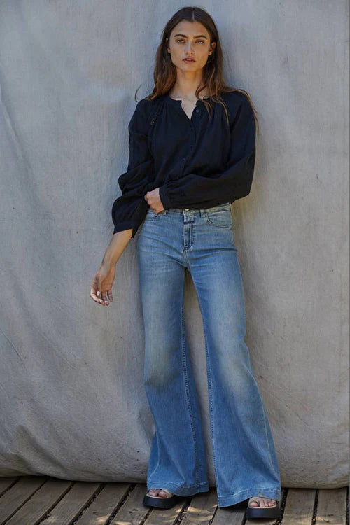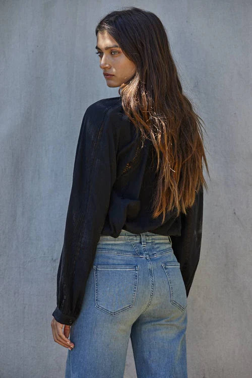 This black woven blouse features subtle embroidery, button closure, and balloon sleeves.
